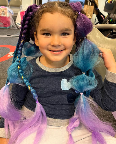 Guests receive a simple hair style with rainbow-colored hair extensions. Our synthetic extensions are attached and removed easily. Our stylists complete each look with glitter gel and hair accessories. This service is great for unicorn parties, school/sporting events, and festival/concert outings.